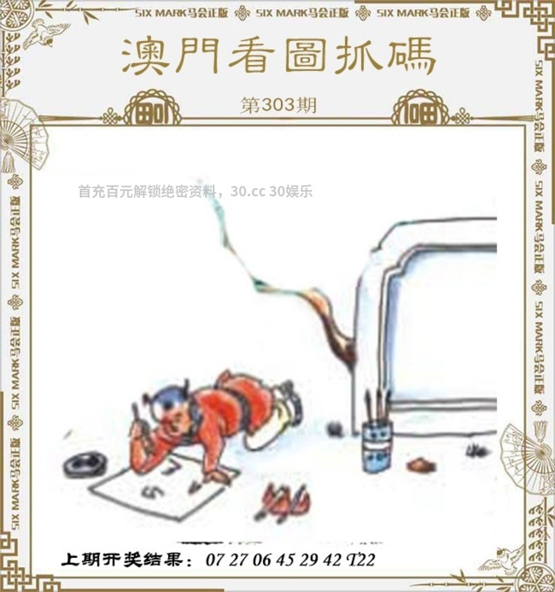 | 303期:【解抓码图】【开:兔15】 破解图文:图中有一个孩子正在地上用毛笔练习写字,他正在写数字5和7,他身旁有一个装有毛笔的笔筒和一个砚台。 综合九肖:猪牛马鸡虎兔羊龙狗 综合七肖:猪牛马鸡虎兔羊 综合十码:07.31.05.24.09.04.15.23.26.32 |